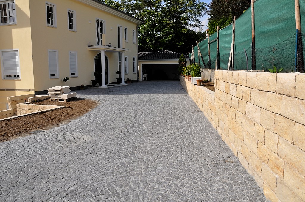 Leistungsumfang: 200 m² Natursteinpflaster, gebundene Bauweise
